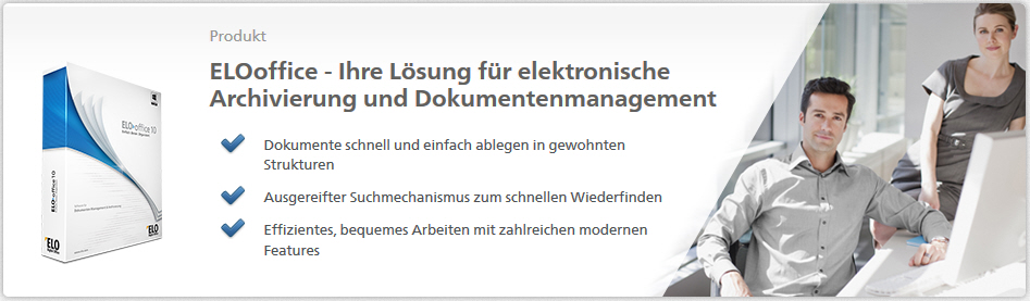 Mit der Software ELOoffice 10 steht Ihnen ein Dokumenten-Management-System (DMS) zur Verfügung, das Ihnen die tägliche Arbeit erleichtert. Belege werden so vorgehalten und organisiert, dass Sie Ihnen blitzschnell zur Verfügung stehen, wenn Sie diese benötigen. Sie arbeiten dabei wie bisher in den Ihnen bekannten Strukturen: der Programmaufbau von ELOoffice basiert auf den bekannten Ordnungsprinzipien Archiv, Aktenschrank, Ordner und Register. Dadurch ist das Arbeiten mit der Software ohne großen Lernaufwand sofort möglich. Per Mausklick navigiert der Anwender in der Aktenstruktur, öffnet Ordner und blättert in Dokumenten.